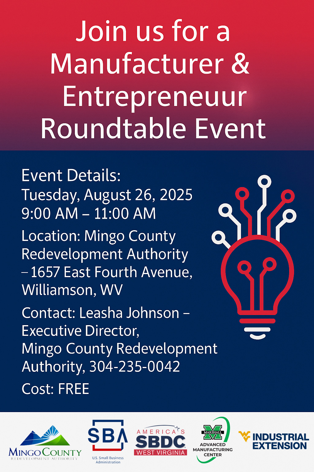 Join us for a Manufacturer and Entrepreneur Roundtable on August 26, 2025, from 9:00 AM to 11:00 AM at the Mingo County Redevelopment Authority (1657 East Fourth Avenue, Williamson, WV). This free event is hosted by the Mingo County Redevelopment Authority in partnership with the West Virginia Small Business Development Center (WV SBDC), and brings together key organizations to support local manufacturers and entrepreneurs.